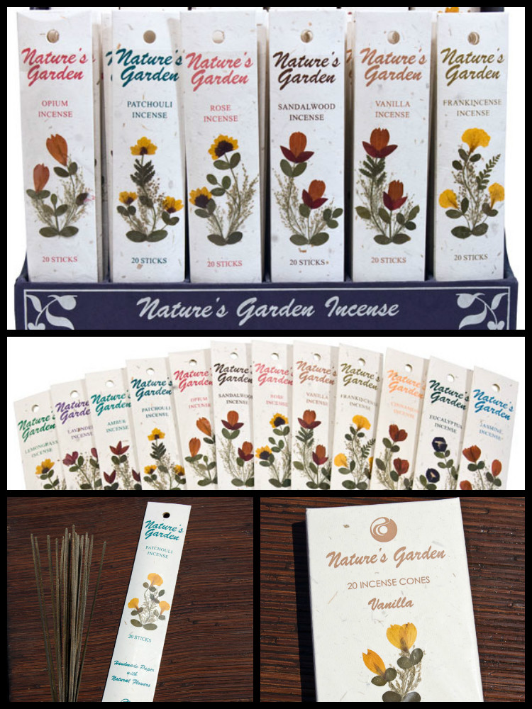 Nature's Garden is a top selling premium incense from India. The incense cones are made of a paste consisting of the powders of dried flower petals, sweet smelling herbs and woods, spices, resins, charcoal and essential oil perfumes. All these ingredients are mixed with water to form a paste. The paste is then filled into cone moulds and left to dry. Before shipping, it is beautifully packaged using handmade paper and individually decorated with dried flowers and leaves.